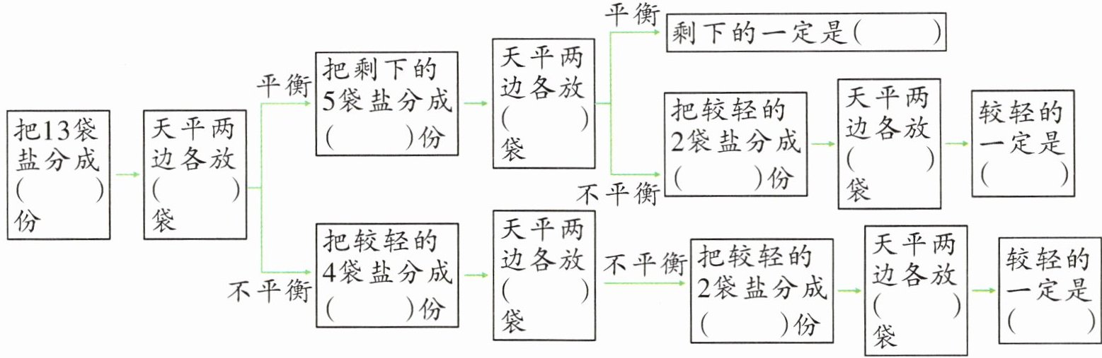 5 妈妈买了13袋盐,其中12袋质量相同,另1袋稍微轻些,是次品。妈妈设计了用天平找次品的方案,请你帮她填完整。