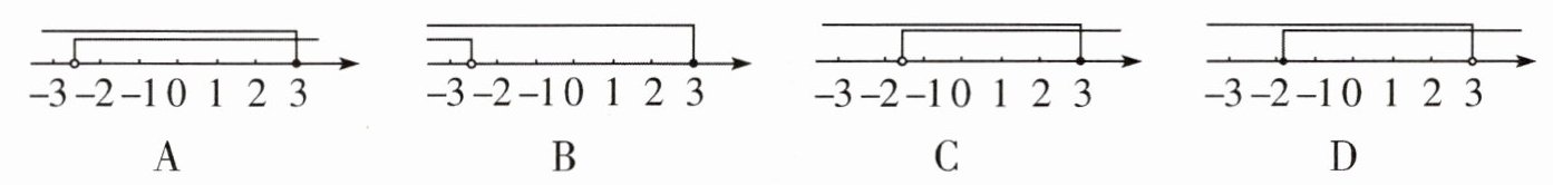 3. 不等式组 $ \left\{ \begin{array} { l } { x - 3 \leqslant 0, } \\ { \frac { 1 } { 3 } ( x - 2 ) < x + 1 } \end{array} \right. $ 的解集在数轴上表示正确的是 (