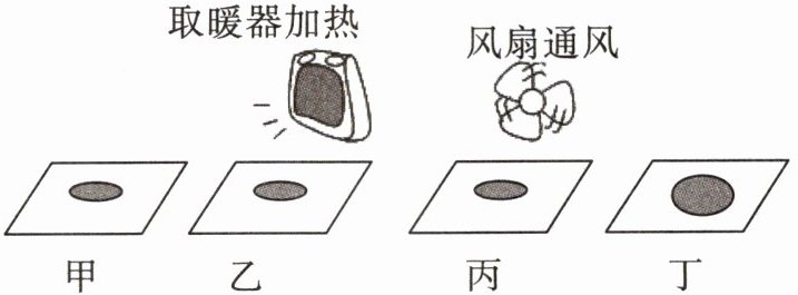 (2)要研究空气流动对蒸发快慢的影响,根据控制变量法,要控制温度和液体表面积相同,改变空气流速。图中甲和丙中,玻璃片上的液体表面积相同,甲没有风扇通风,丙有风扇通风,空气流速不同,所以选择甲和丙可以研究空气流动对蒸发快慢的影响。若丙中液体先消失,说明在相同条件下,空气流动越快,蒸发越快。