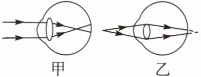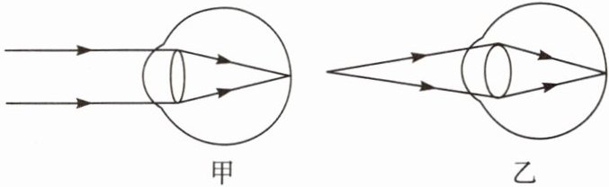 本题考查眼睛及其视物原理。眼睛通过睫状体来改变晶状体的形状,当睫状体放松时,晶状体比较薄,远处物体射来的光刚好会聚在视网膜上,眼睛可以看清远处的物体。观察甲图,其中晶状体较薄,因此这是看远处景物时的光路图。人眼看远处物体时,物距大于二倍焦距,根据凸透镜的成像原理,此时景物在视网膜上成的是实像。