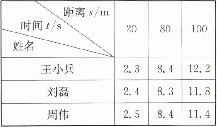 4.(百色中考)运动会男子100m决赛,同学们测量了运动员跑到离起点20m、80m、100m处的时间。其中前三名的时间见下表,下列说法正确的是(
