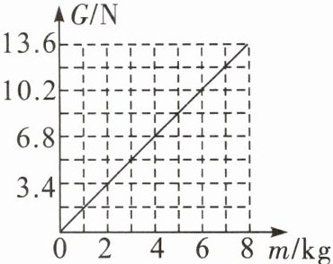 (2)在月球上物体的重力G与其质量m的关系图像中,任取月球上物体的重力G与其质量m的对应值,可得物体在月球上的重力与其质量的比值,则$g_{月}=\frac{G'}{m'}=$$\frac{13.6\ \text{N}}{8\ \text{kg}}=1.7\ \text{N/kg}$