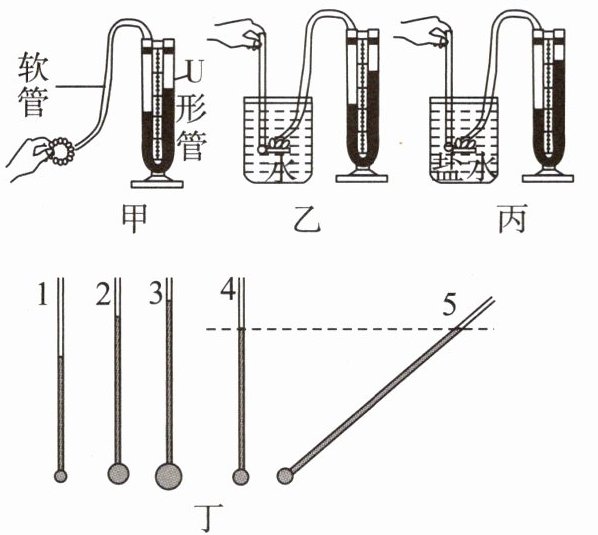 (3)换用五根一端蒙有相同橡皮膜的玻璃管(粗细相同),探究影响液体压强大小的因素。管中加入适量的水,如图丁所示。