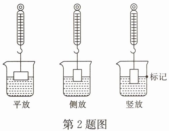 2.(盐城中考)如图所示,小聪用一个长方体铝块“探究影响浮力大小的因素”。他先后将该铝块平放、侧放和竖放,使其部分浸入同一杯水中,保证每次水面到达同一标记处,比较弹簧测力计示数大小。该实验探究的是下列哪个因素对浮力大小的影响(