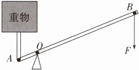 (1)首先,需要利用杠杆原理来计算在B端施加的力。杠杆原理的公式为$F_1L_1 = F_2L_2$,其中$F_1$和$L_1$分别是动力和动力臂,$F_2$和$L_2$分别是阻力和阻力臂。在这个问题中,动力臂是OB,阻力臂是OA,阻力是重物的重力,即$F_2 = G = mg$。将已知数值代入公式,可以求解出动力$F_1$。