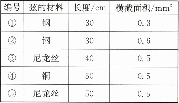 |编号|弦的材料|长度/cm|横截面积$/mm^2$|