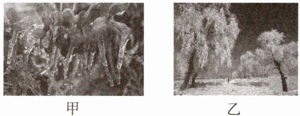 11. 黄山景色闻名天下,严冬经常会出现“雨凇”现象,这种现象一般是由在朔风里飘扬的雨滴附于树枝、草等物体上而形成的冰晶,如图甲所示;而松花江畔,严冬却经常出现“雾凇”现象,它是由水蒸气遇冷凝结并附在树枝上形成的冰晶,如图乙所示。“雨凇”“雾凇”形成时的物态变化是