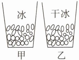 9. (沈阳中考)小组同学做对比实验,如图所示,在甲、乙两个相同杯子中分别放入适量的冰块和干冰块。放置一段时间后,发现杯内物块均变小。甲杯内有液体出现,外壁有小水珠生成;乙杯内仍然是干燥的,外壁有一层薄霜生成。下面分析正确的是(