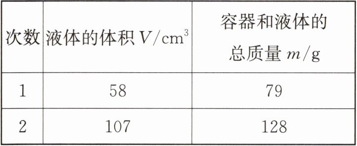 4. (济宁中考)在测定某液体密度时,小明做了两次实验并做了如下记录,则液体的密度$\rho=$