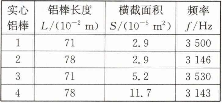 |实心铝棒|铝棒长度L/(10⁻^2m)|横截面积S/(10⁻^5m^2)|频率f/Hz|
