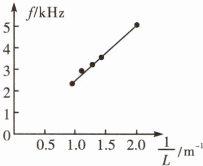 (2)为了验证猜想B,同学们选择横截面积均为2.9×10⁻^5m^2的铝棒,实验所得的数据记录于下面的表格中。同学们从表中前两列数据很难得出频率f与长度L之间的关系,他们利用图像法处理数据,画出了频率f与长度的倒数$\frac{1}{L}$的关系,如图所示,分析可知发声频率f与铝棒的长度L的关系是______