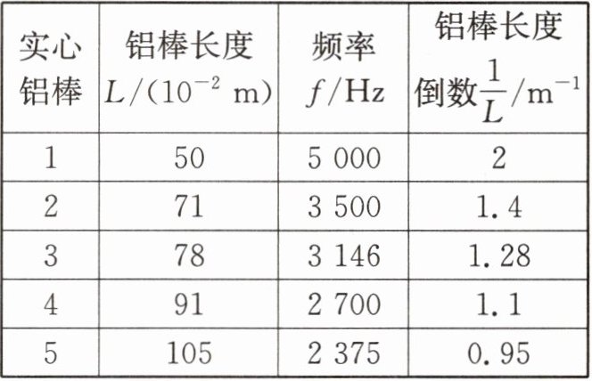 。|实心铝棒|铝棒长度L/(10⁻^2m)|频率f/Hz|铝棒长度倒数$\frac{1}{L}/m^{-1}$|