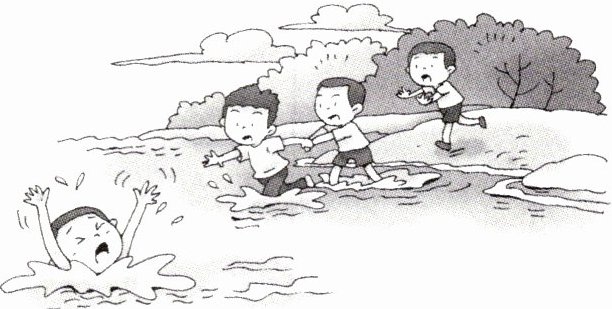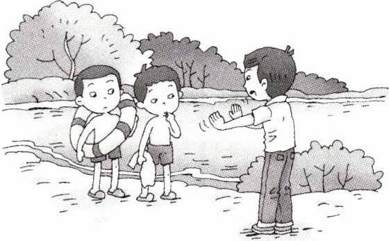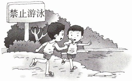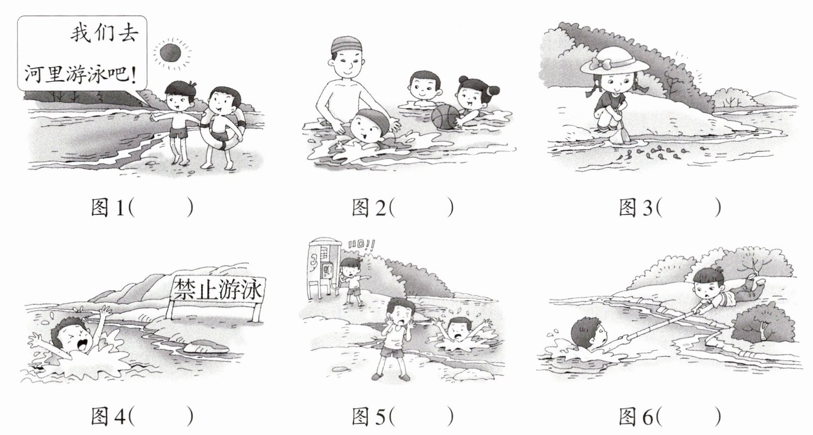 (2)这四名学生擅自结伴外出,在没有大人陪同的情况下就到不熟悉的河里游泳,没有任何安全设施,也没有救护人员,所以发生了意外。(3)图1(×)图2(√)图3(×)图4(×)图5(√)图6(√)示例:我认为图2的做法是对的,因为这几个孩子是在大人的陪同下游泳的。我认为图3的做法是不对的,因为在河边玩耍,稍不注意就会失足落水,发生意外。我认为图4的做法是不对的,因为这个地方是禁止游泳的。我认为图5的做法是对的,小学生没有能力下水救人,应该在第一时间呼救,拨打救援电话,去找大人帮忙。我认为图6的做法是对的,在保证自身安全的情况下,可以将竹竿伸给落水者,让对方抓住竹竿往岸边游。