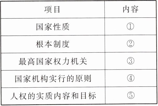 (1)①中华人民共和国是工人阶级领导的、以工农联盟为基础的人民民主专政的社会主义国家。②社会主义制度。③全国人民代表大会。④民主集中制。⑤人自由、平等地生存和发展。