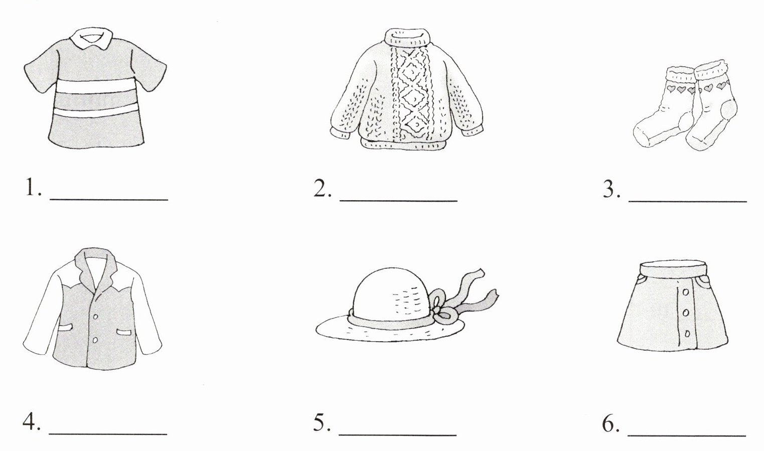 1. T-shirt 2. sweater 3. socks 4. coat 5. hat 6. skirt
