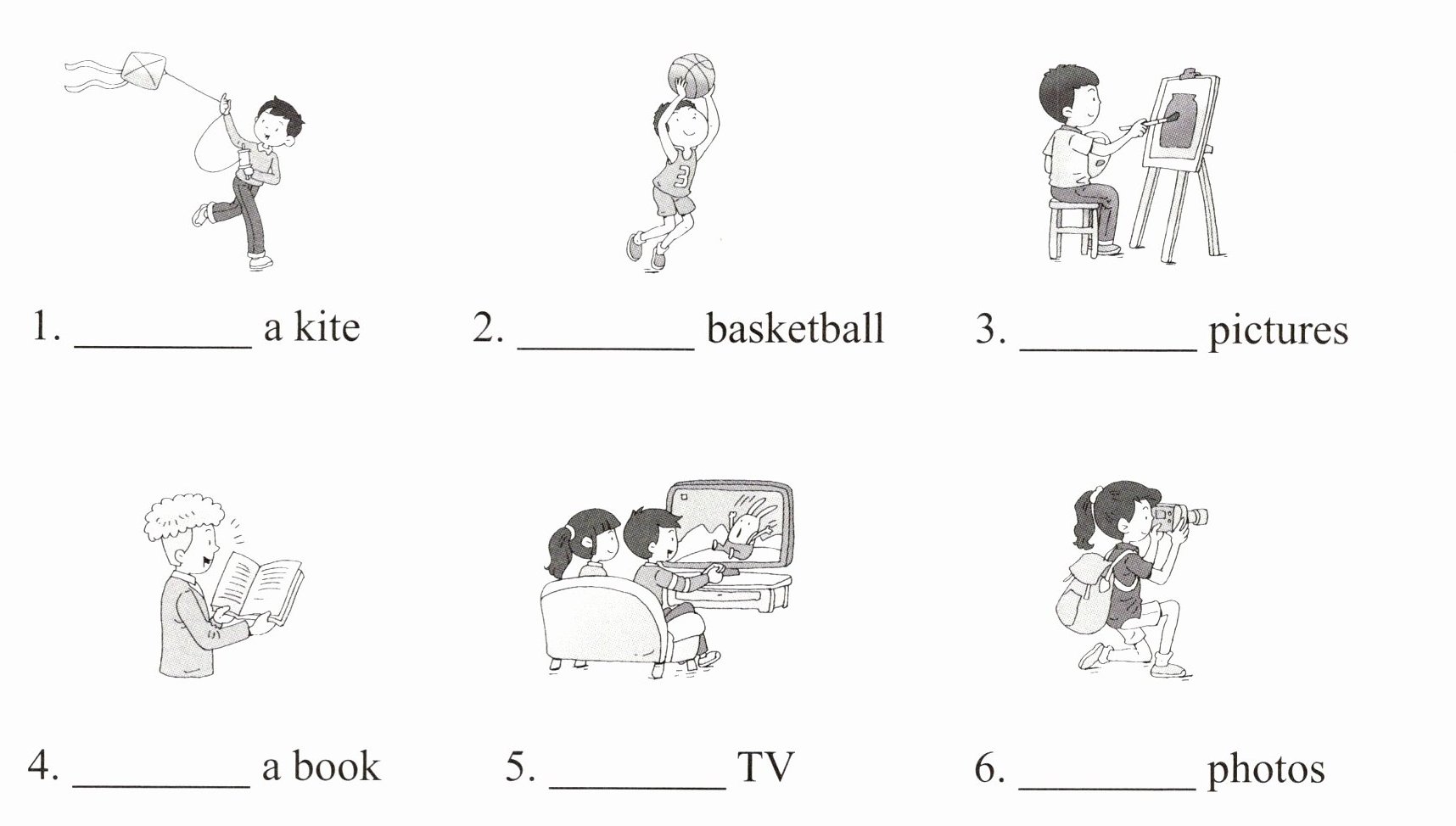 1. fly 2. play 3. draw 4. read 5. watch 6. take