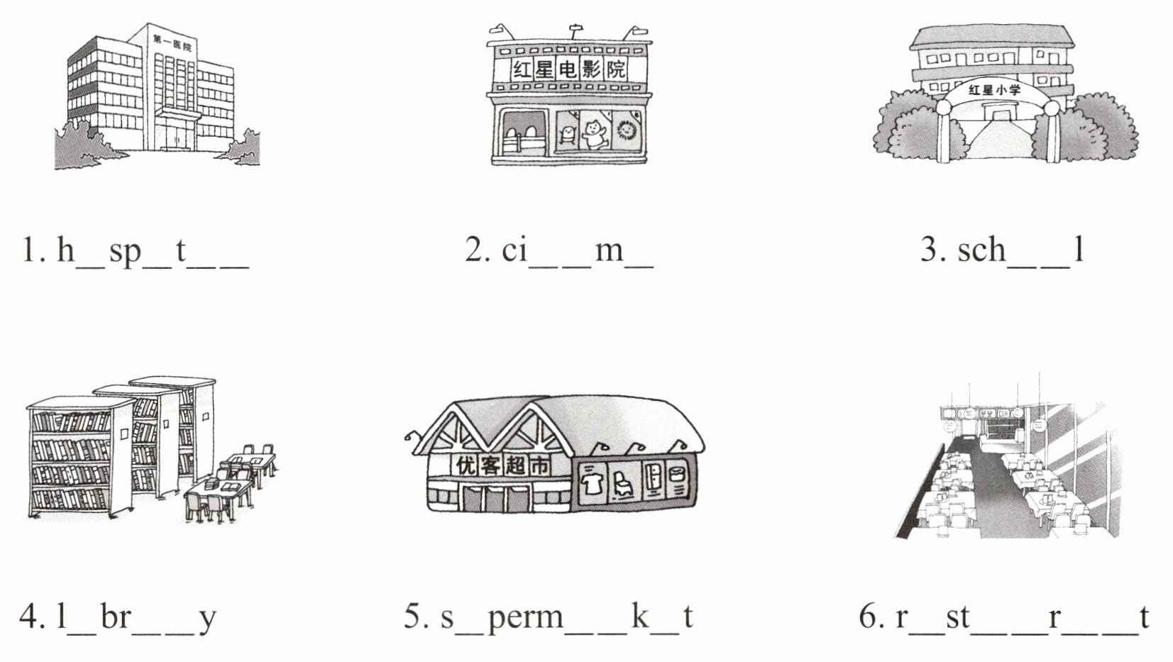 1. school 2. store 3. restaurant 4. mountains 5. theatre