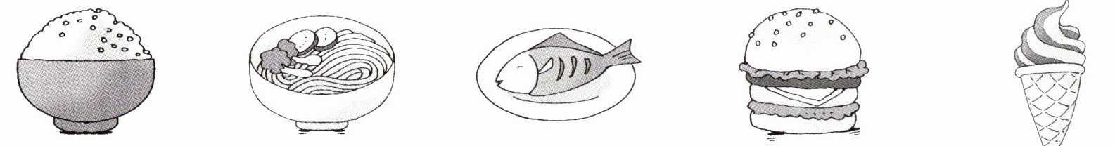 1. rice 2. noodles 3. fish 4. hamburger 5. ice cream