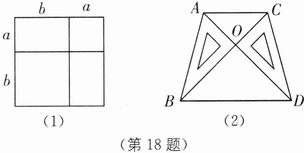 (1)观察图(2),请你写出 $(a + b)^{2}$,$(a - b)^{2}$,$ab$ 之间的等量关系: