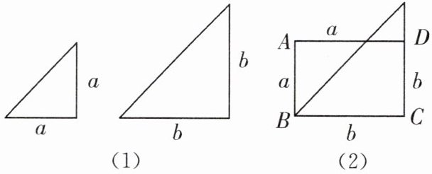 用直角边分别为$a和b$的两个等腰直角三角形进行拼图,由图(1)得到图(2).