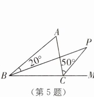 5. (2025·甘肃张掖期末)如图,$BP是\triangle ABC中∠ABC$的平分线,$CP是\triangle ABC$的外角的平分线,若$∠ABP = 20^{\circ}$,$∠ACP = 50^{\circ}$,则$∠A + ∠P = $(