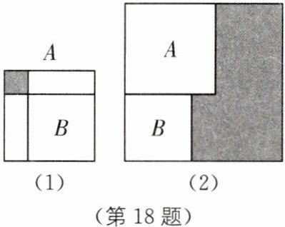 18. 一题多问(2025·北京东城区期末)如图,有正方形$ A $,$ B $,现将$ B 放在 A $的内部得图(1),将$ A $,$ B $并列放置后构造新的正方形得图(2),若图(1),图(2)中阴影部分的面积分别为4,30。证明: