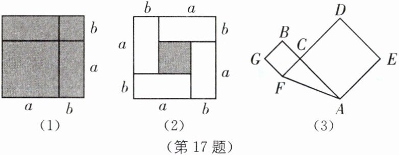 17. 数形结合思想(2025·湖北黄冈期末)数形结合是数学学习的一种重要的思想方法,借助图的直观性,可以帮助理解数学问题。如图(1)是一个边长为$ a + b $的正方形,用两条分割线将其分为两个正方形和两个长方形,正方形的边长分别为$ a 和 b $,阴影部分的面积所揭示的乘法公式是$ (a + b)^{2} = a^{2} + 2ab + b^{2} $。