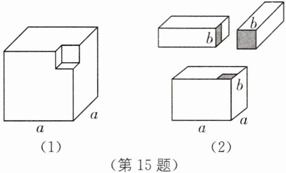 15. (2025·河南南阳期中)如图(1)是一个棱长为 $ a $ 的正方体中挖去一个棱长为 $ b $ 的小正方体 $ (a>b) $,将剩余部分进行切割得到如图(2)所示的三个长方体.通过计算剩余部分的体积,可对多项式 $ a^{3}-b^{3} $ 进行因式分解,即 $ a^{3}-b^{3}= $____.