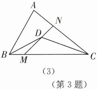②如图(3),若$MN绕点D$旋转,分别交线段$BC$,$AC于点M$,$N$,试问在旋转过程中$∠NDC-∠MDB$的度数是否会发生改变?若不变,求出$∠NDC-∠MDB$的度数(用含$\alpha$的代数式表示);若改变,请说明理由.