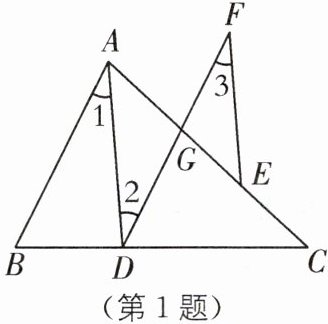 1. 如图,在$\triangle ABC$中,点$D$,$G分别在边BC$,$AC$上,且$∠B= ∠GDC$,$F在DG$的延长线上,$E在GC$上,如果$∠AGF= ∠DAG+∠3$,试说明$∠1= ∠3$.