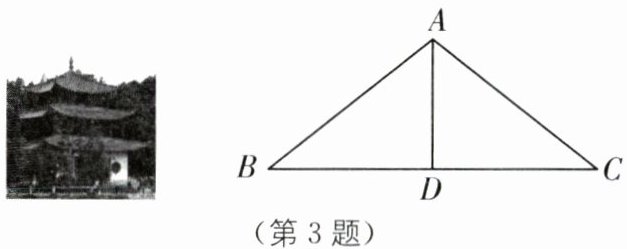 3.(2025·云南昆明期末)大观公园是国家4A级旅游景区,始建于明朝洪武元年(公元1368年),位于昆明市以西约2公里的滇池湖畔,完好保存着许多古典园林建筑群,既反映中国清代古建筑的风格,又具有云南地方民族建筑的特色,是云南清代园林建筑的博览苑.如图,建筑的顶端可看作等腰三角形ABC,$AB= AC$,D是BC的中点.下列结论不一定正确的是( ).