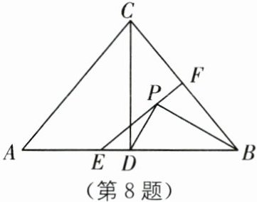 8.(2024·湖北襄阳期末)如图,在$△ABC$中,$AC= BC,AB= 6,△ABC$的面积为 12,$CD⊥AB$于点D,直线EF垂直平分BC交AB于点E,交BC于点F,P是线段EF上的一个动点,则$△PBD$的周长的最小值是( ).