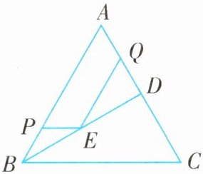 例7 (2025·四川广元苍溪期末)如图,在等边三角形ABC中,BD是中线,点P,Q分别在AB,AD上,且BP = AQ = QD = 1,动点E在BD上,则PE + QE的最小值为______。