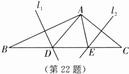 22.(2025·江苏苏州期末)如图,在$△ABC$中,边AB的垂直平分线$l_{1}$与边BC相交于点D,边AC的垂直平分线$l_{2}$与边BC相交于点E(D在E的左侧).若$△ADE$的周长为8,$∠DAE= 60^{\circ }$.