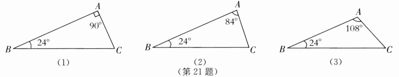 21.(1)如图(1),$∠A= 90^{\circ }$,请用直尺和圆规作一条直线,把$△ABC$分割成两个等腰三角形(不写作法,但须保留作图痕迹).