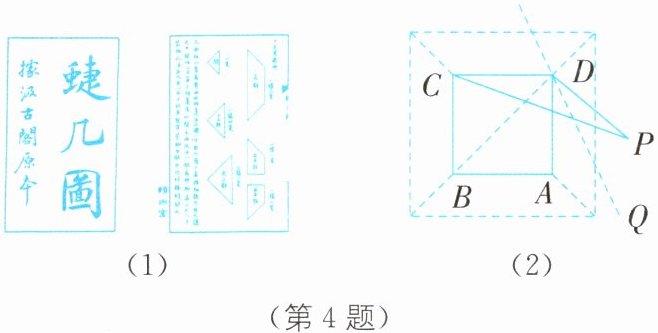 4. (2024·辽宁盘锦大洼区期末)《蝶几图》是明朝人戈汕所作的一部组合家具的设计图(蜨同“蝶”),如图为某蝶几设计图,其中△ABD和△CBD为“大三斜”组件(大三斜组件为两个全等的等腰直角三角形),已知某人位于点P处,点P与点A关于直线DQ对称,连接CP,DP,若∠ADQ = 25°,则∠DCP的度数为( )。