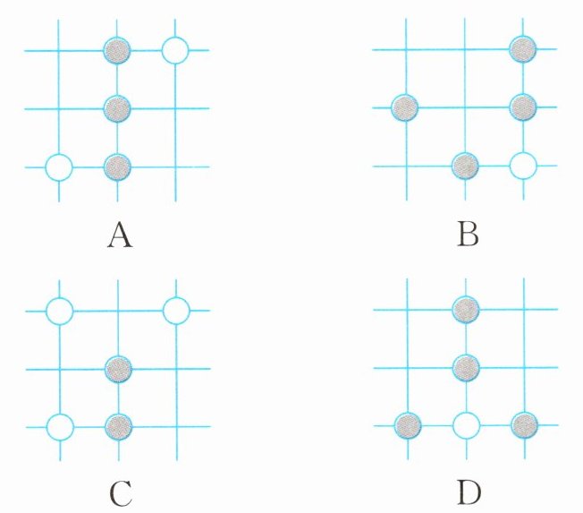 3. (2025·河南商丘期末)围棋起源于中国,古代称之为“弈”,至今已有四千多年的历史,下列由黑白棋子摆成的图案是轴对称图形的是( )。