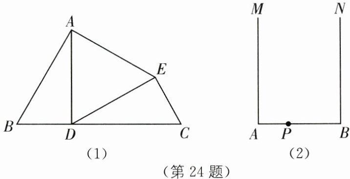 (2)如图(2),射线$AM与BN,MA⊥AB,NB⊥AB$,点$P是AB$上一点,在射线$AM与BN上分别作点C,D$,满足:$\triangle CPD$为等腰直角三角形.(要求:利用直尺与圆规,不写作法,保留作图痕迹)