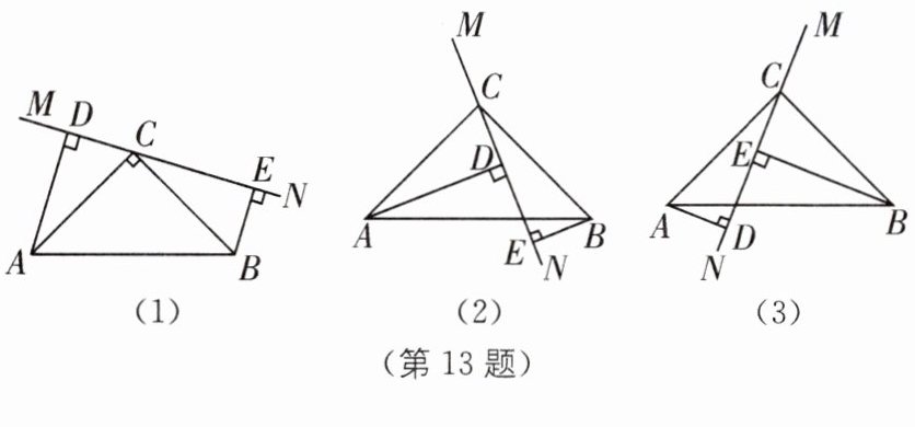 13. 一线三等角模型 在△ABC中,∠ACB= 90°,AC= BC,直线MN经过点C,且AD⊥MN于点D,BE⊥MN于点E.