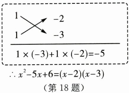 18.(2024·浙江绍兴期末)对于二次三项式$x^{2} + mx + n$,如果能将常数项$n分解成两个因数a,b$,使$a,b的和恰好等于一次项系数m$,即$ab = n,a + b = m$,就能将$x^{2} + mx + n$分解因式.这种分解因式的方法取名为“十字相乘法”.为使分解过程直观,常常采用图示的方法,将二次项系数与常数项的因数分列两边(如图),再交叉相乘并求和,检验是否等于一次项系数,进而进行分解.则代数式$x^{2} - 2x - 15$因式分解的结果为____.