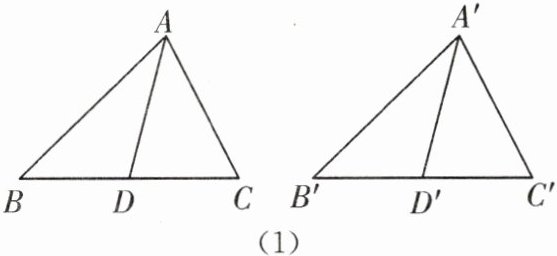如图(1),$AD$,$A'D'分别是\triangle ABC和\triangle A'B'C'的BC$,$B'C'$边上的中线,$AD= A'D'$,$AB= A'B'$,$BC= B'C'$.求证:$\triangle ABC\cong\triangle A'B'C'$.