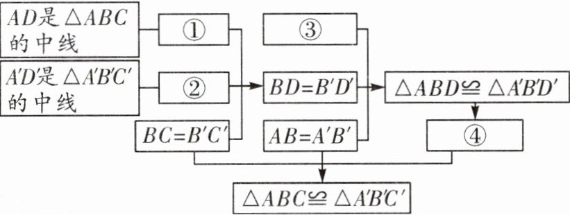 (1)①BD=$\frac{1}{2}$BC ②B'D'=$\frac{1}{2}$B'C' ③AD=A'D' ④∠B=∠B' [解析]