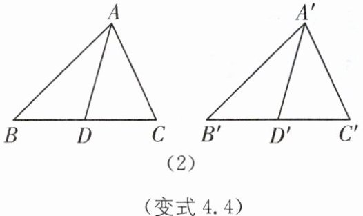 如图(2),$AD$,$A'D'分别是\triangle ABC和\triangle A'B'C'的BC$,$B'C'$边上的中线,$AD= A'D'$,$AB= A'B'$,$AC= A'C'$.判断$\triangle ABC与\triangle A'B'C'$是否仍然全等,并说明理由.