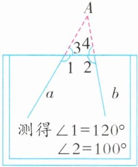 解答本题需要把实际情境问题转化为数学问题,延长直线$a$,$b交于A$点,根据$\angle 1 = 120^{\circ}$,$\angle 2 = 100^{\circ}$,可求出$\angle 3$,$\angle 4$,最后根据三角形的内角和,即可求解.