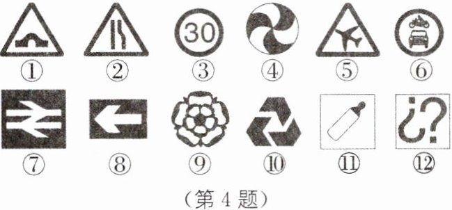 ①③⑤⑧⑪是轴对称图形,均只有一条对称轴;②④⑥⑦⑩⑫不是轴对称图形;⑨是轴对称图形,有五条对称轴.