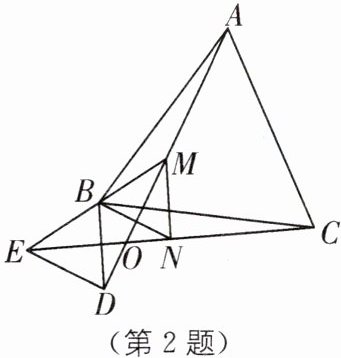 2. (2025·陕西延安延长期末)将等边三角形 ABC 与等边三角形 BDE 按如图所示的位置放置,连接 AD,CE,交点为 O,M,N 分别是线段AD,CE 的中点,连接 BM,MN,BN.
