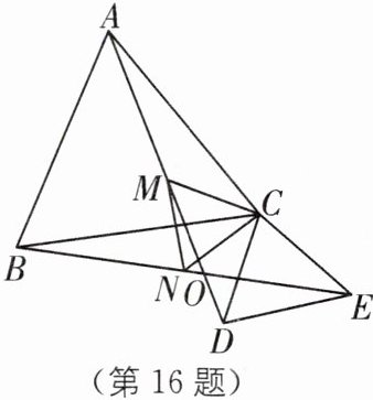 16. 如图,$△ABC,△CDE$都是等边三角形,AD,BE 相交于点 O,点 M,N 分别是线段AD,BE 的中点.