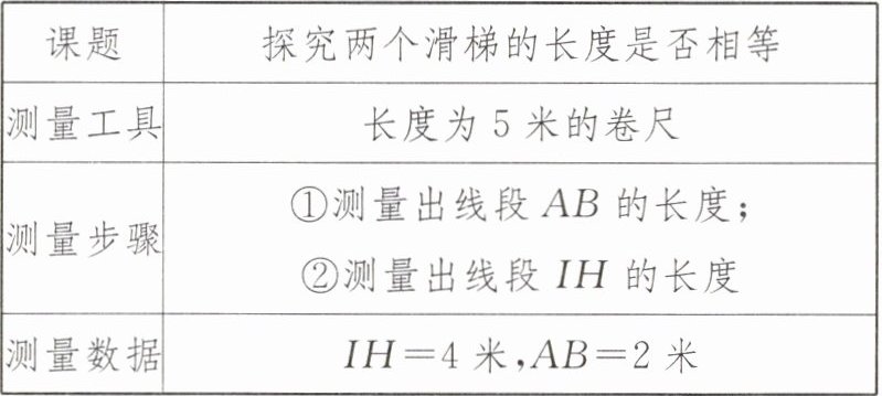 (1)根据小明的测量方案和数据,判断两个滑梯$AE和GH$的长度是否相等,并说明理由;