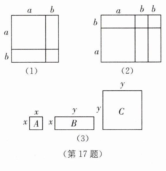 17. 数形结合思想(2025·福建漳州长泰区期中)数形结合是解决数学问题的重要思想方法,借助图形可以对很多数学问题进行直观推导和解释.例如图(1),利用面积的不同表示方法可以用来解释代数恒等式$(a+b)^{2}= a^{2}+2ab+b^{2}.$