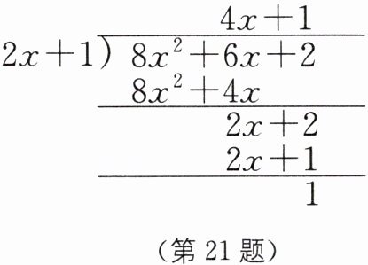 21. 中考新考法 解题方法型阅读理解题 (2025·江苏南通 崇川区期中)我们学过单项式除以单项式、多项 式除以单项式,那么多项式除以多项式该怎 么计算呢? 我们也可以用竖式进行类似演 算,即先把被除式、除式按某个字母降幂排 列,并把所缺的项用零补齐(或留出空白), 再类似于数的竖式除法求出商式和余式,其 中余式为0或余式的次数低于除式的次数. 例如:计算$(8x^{2}+6x+2)÷(2x+1)$,可用 如图的竖式进行计算.因此商式是$4x+1,$ 余式是1.